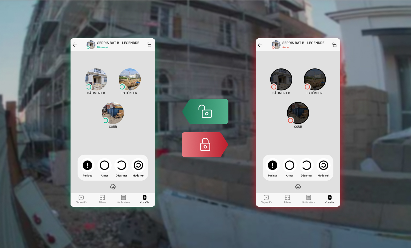 Nos clients disposent d’une application intuitive pour gérer eux-mêmes l’armement et le désarmement, s’il souhaitent rester ou accéder au site en dehors des horaires